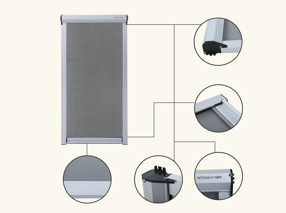 (2)采用優(yōu)質(zhì)液壓阻尼,確保紗網(wǎng)回卷時平穩(wěn)順暢、勻速柔和。