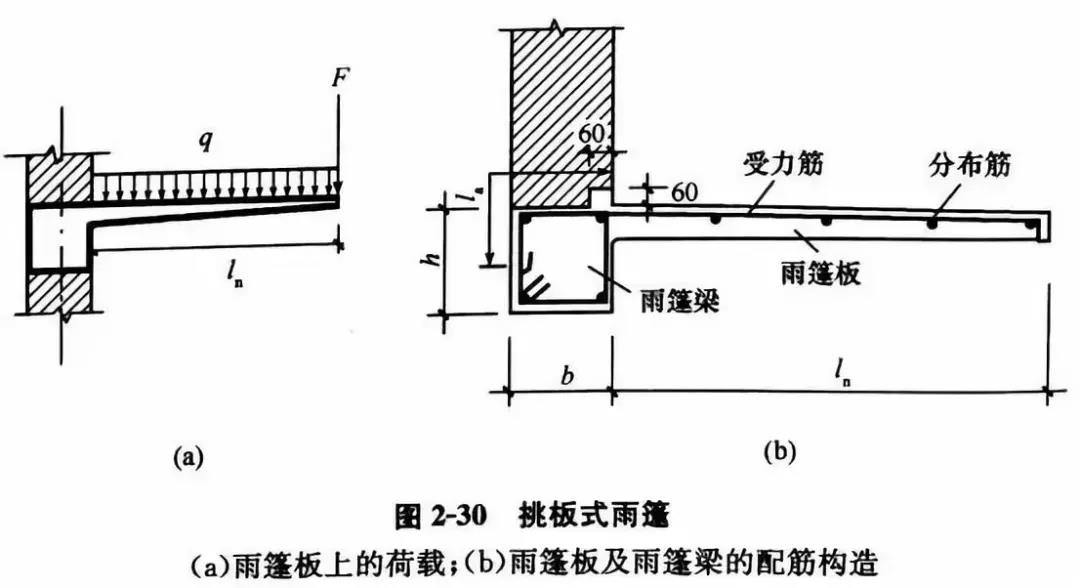 雨篷板為一典型懸臂受彎構件。雨篷板承受的荷載除有恒載(板自重、面層、抹灰等構造層重)、均布活荷載外,還應考慮施工荷載或檢修的集中荷載,見上圖(a)。