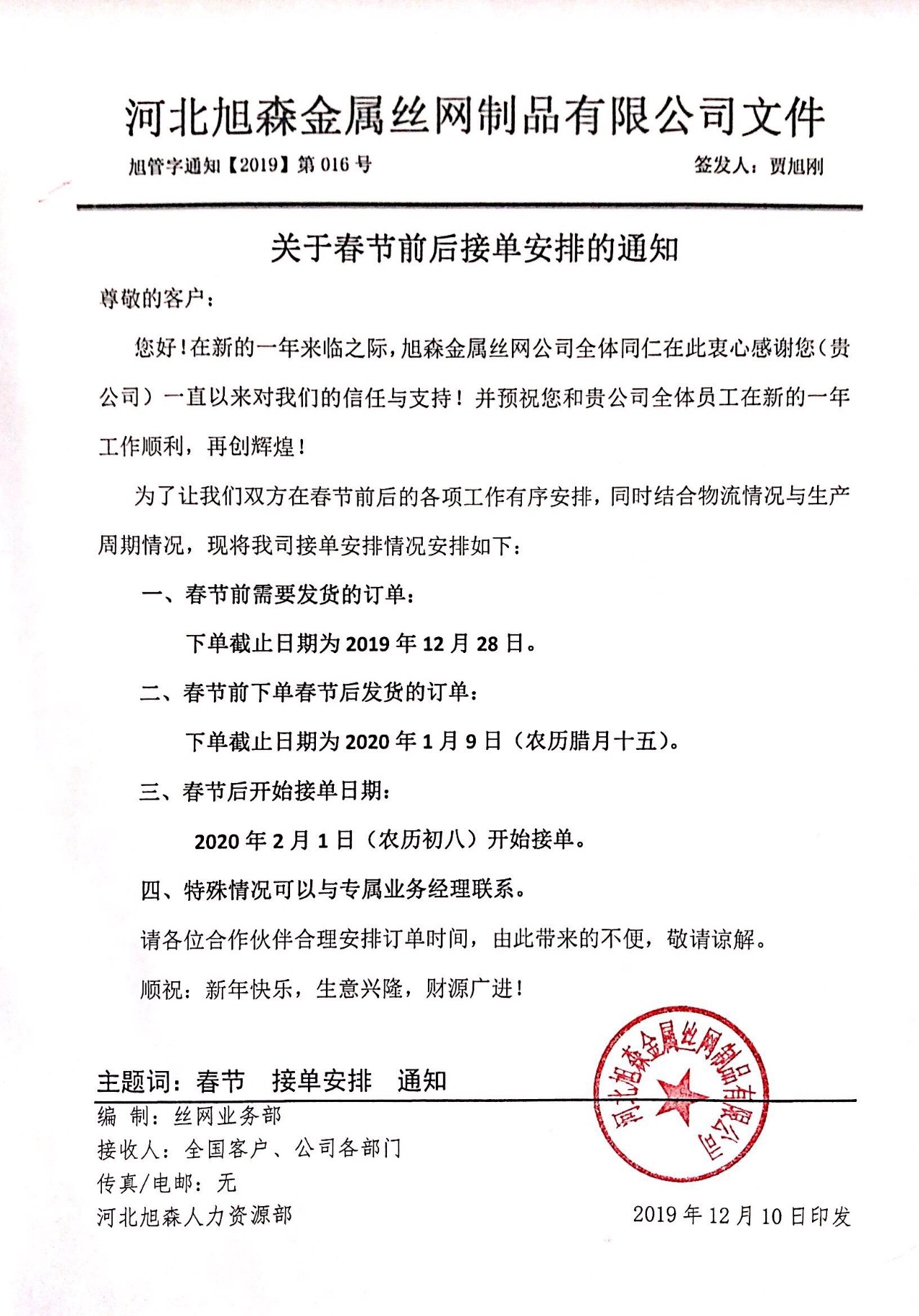 公告:旭森公司年底售后及接單安排通知!請各位客商安排下單時間